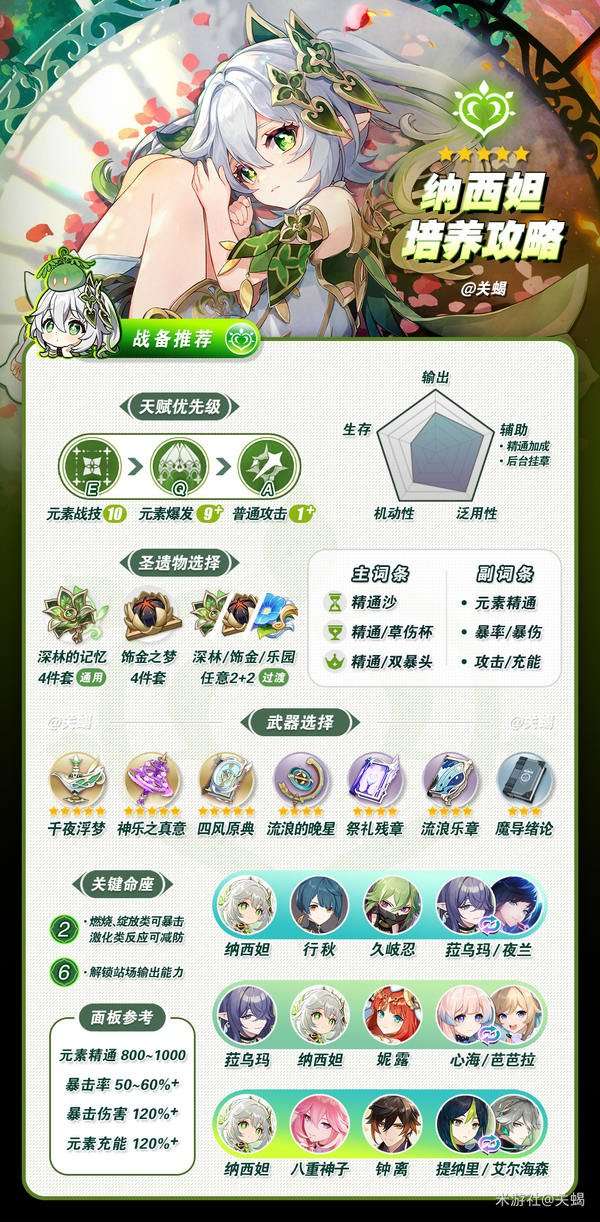 限定·5星草元素法器角色,主要定位后台输出、挂草、兼增伤辅助,[元素战技]可提供长时间、大范围后台稳定挂草,被标记的敌人触发元素反应或受到草原核伤害时,会引发[灭净三业]造成草元素伤害;[元素爆发]能基于队伍中最高元素精通的25%,为场上角色提供最多250点元素精通加成,显著提升队伍元素反应伤害;阵容组建可融入多种草元素反应体系,是众多草元素相关反应队伍中的核心角色。