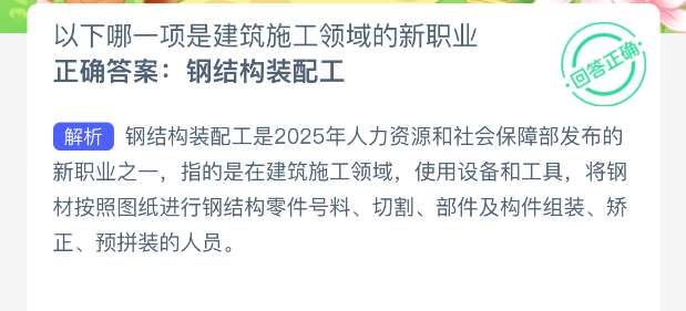 软件提交 专题合集 热门手游以下哪一项是建筑施工领域的新职业?【蚂蚁新村每日一题】2025年11月9日题目已发布!坚持答题,积累木兰币,即可加速小镇建设。答对本题,立即可享“产速+3/时”的加速奖励!今天正确答案是【钢结构装配工】。钢结构装配工是指的是在建筑施工领域,使用设备和工具,将钢材按照图纸进行钢结构零件号料、切割、部件及构件组装、矫正、预拼装的人员。
