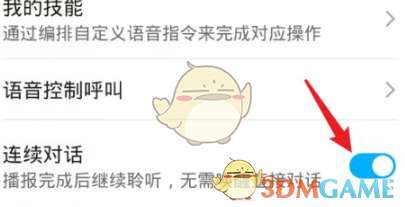 3、在语音助手设置界面,点击连续对话后方的开关。