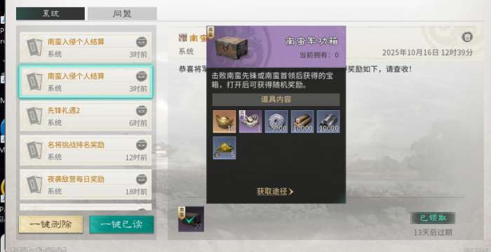 【南蛮入侵】:城池清剿南蛮完成后,根据清剿南蛮队伍数获得对应奖励,击败先锋或首领可获得大量银币元宝以及资源奖励。