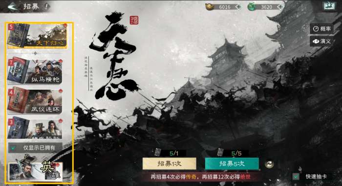 除此之外,还有一些其他的定向卡包,如【三足鼎立】、【炎汉龙吟】、【纵马横枪】等,分别包含不同的英雄和技能组合,可以在中后期用来定向招募某些英雄和技能。