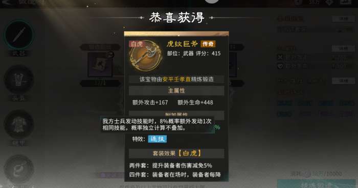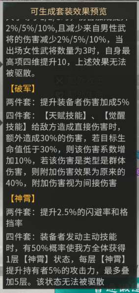 宝物穿戴时,也可以生成套装效果,从而获得额外的属性加成。目前一共有七中不同的套装,分别为:霸王、烛龙、白虎、神农、巾帼、破军、神霄,每一种套装都有两件套/四件套的套装效果,针对性的选择套装效果,可以大幅度提高队伍强度。