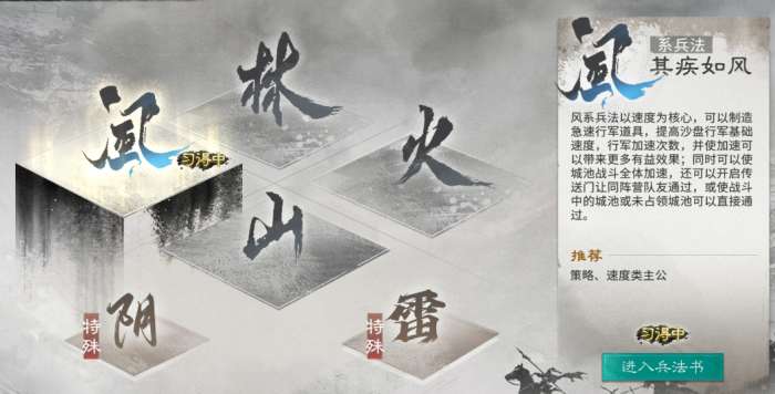 风系兵法:所谓其疾如风,风系兵法主要提高的是部队的行进速度,例如制造【极速鞋】、被动提高部队行军速度、使部队二次加速、穿越正在作战的城池等等,大幅度提高行军效率与速度。