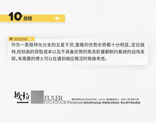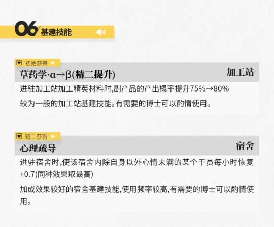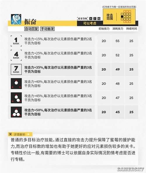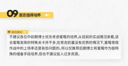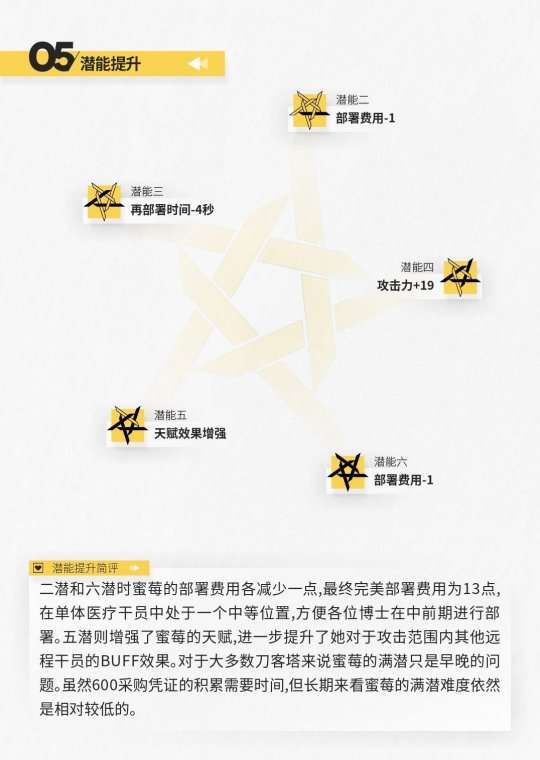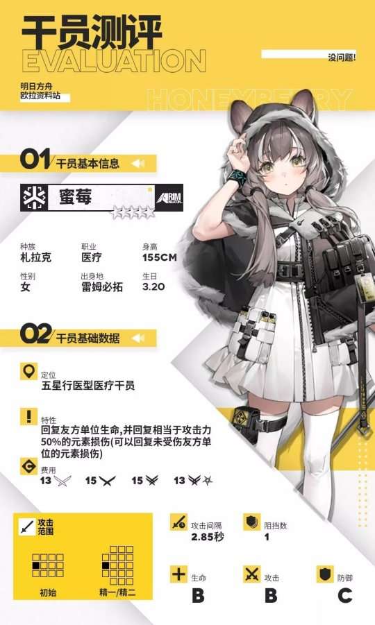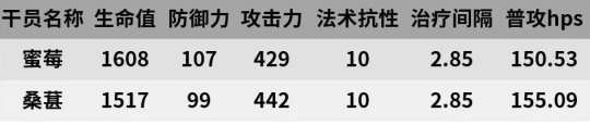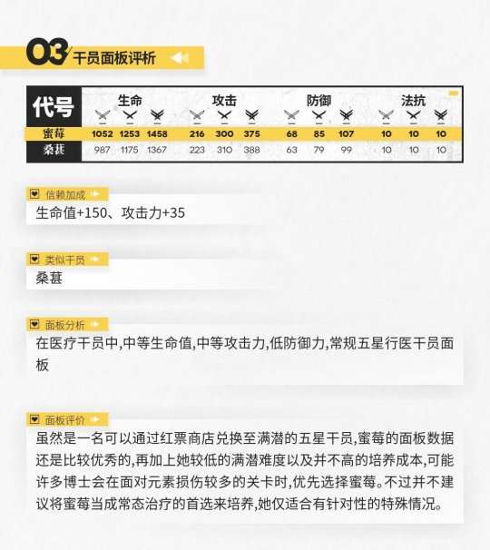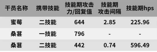 从数据表中可以看出,蜜莓使用二技能后的属性数据还是很不错的。但是,她较长的攻击间隔严重限制了她在实际战斗中的治疗能力,如果要追求纯粹的治疗能力,更建议寻求普通医师干员的帮助。