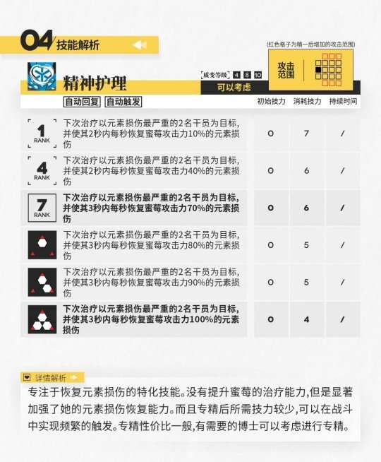 这位医疗干员专门治疗元素损伤,现已经是第二位与元素损伤相关的医疗干员。这种情况让人担心这种敌人是否会再次出现。然而,蜜莓作为解决元素损伤的重要干员,值得我们更深入的了解。这部分内容将进一步介绍蜜莓,以帮助博士们更好地使用她应对实战场景。