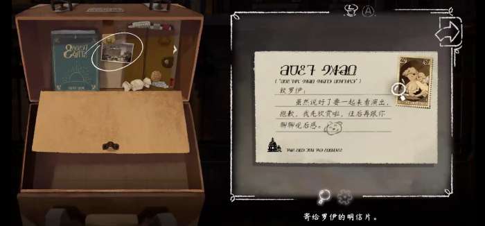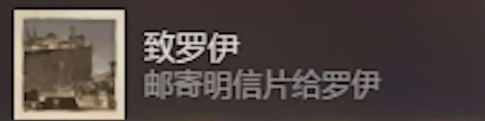 3、拿到明信片后打开背包查看明信片,会发现明信片在包包夹层不在外层,如果查看明信片可在背面看到文字,那就是寄给罗伊的,之后在大剧院那里的红色邮简里寄出去即可完成