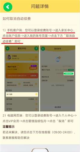 手机客户端:您可以登录续费账号;进入家长中心,点击账户信息,进入我的账号页面,点击下方“取消自动续费”即可。