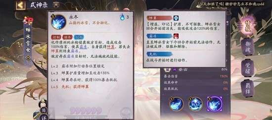 二技能:全体友方提升30%的防御,友方和敌方回合结束,sp雪女结出一朵冰花(没叠加6层,对所有人造成间接伤害)。友方式神阵亡时,以凝结形态占据原位置。