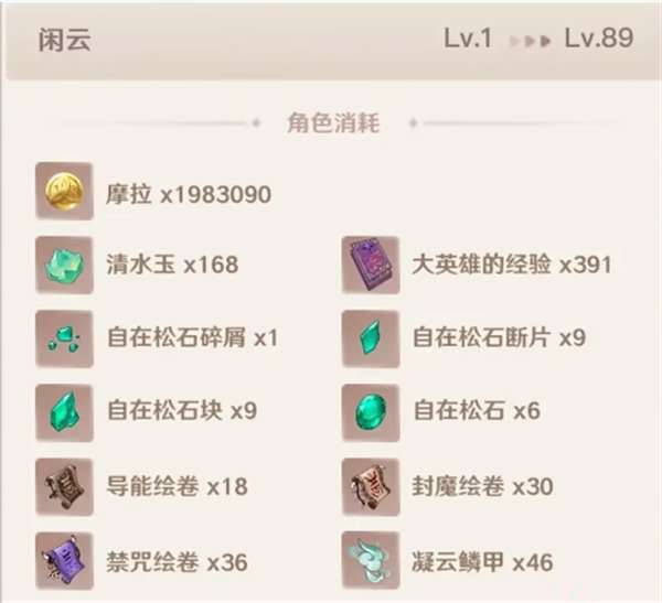 6、 80级突破:摩拉*12w、自在松石*6. 凝云鳞甲*20、清水玉*60、禁咒绘卷*24