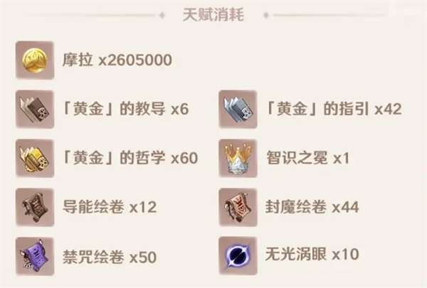 9. 10级:黄金的哲学*16、禁咒绘卷*12、无光涡眼*2、智识之冕*1.摩拉*70w