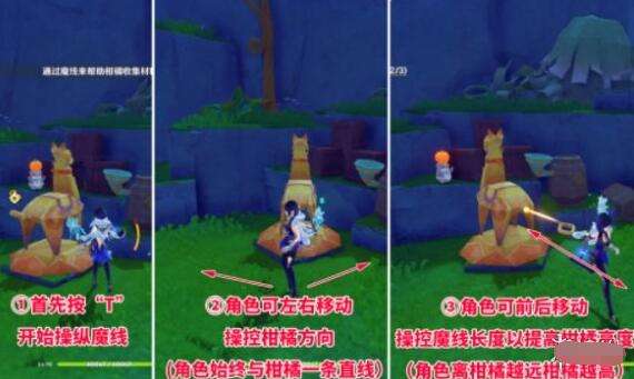 3、角色要是前后移动那么就可以控制魔线长度这样柑橘的高度就会提还是那个,所以角色离柑桶越远那么这个柑桶越高。