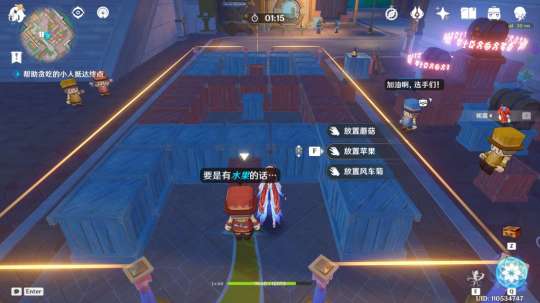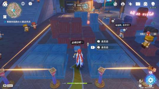 比赛内容是与旁边三位积木小人合作,让他们抵达终点即可。