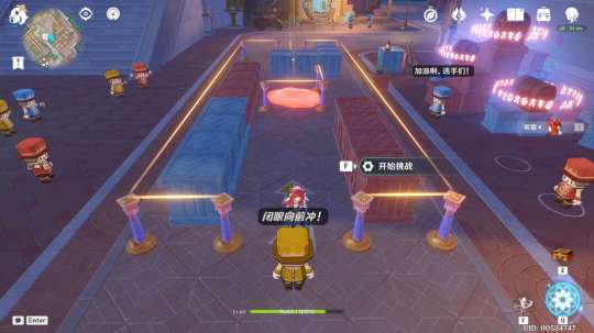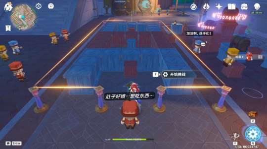 与贪吃的小人组队后,直接点开始挑战就行,开始后请一直跟随他。