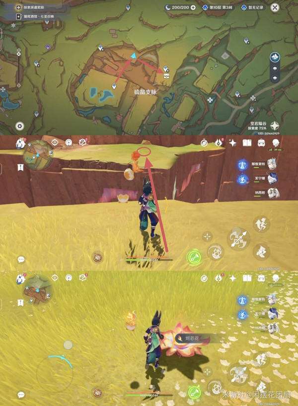 从传送点出发,跟着箭头走,先获取一个烬芯花