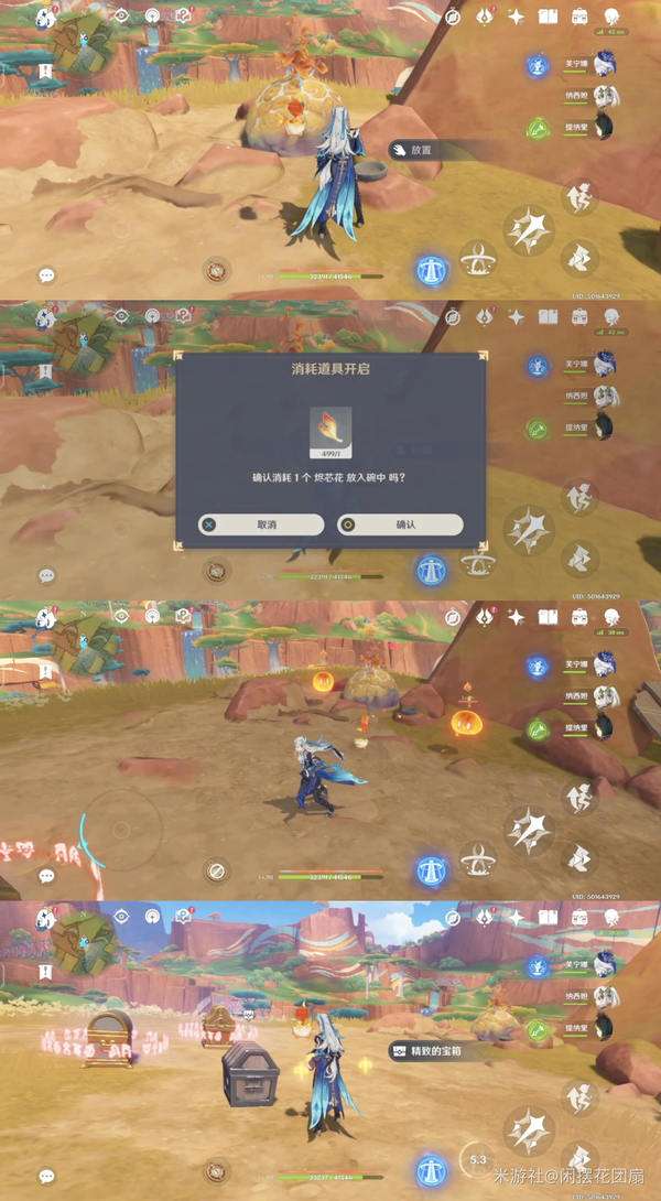 靠近石头旁的盘子处放置烬芯花,击败出现的史莱姆解锁精致宝箱