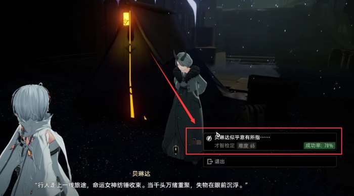 “贝琳达似乎意有所指”的技能鉴定难度是65,玩家只需要让自己的道德水准达到六十点以上,即可获得百分之七十以上的成功率,成功鉴定后,玩家即可说服贝琳达,保证后续任务的进展顺利。