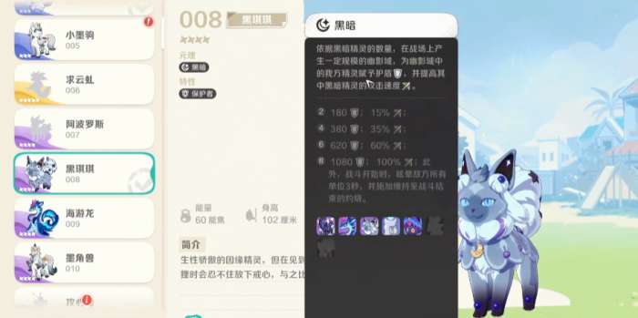 像夜影这类黑暗特性的精灵来说,其实在战场上他们会带来的效果都是根据自身位置带来足够的护盾效果,这里夜影他作为前排可以带来保护的一方面能力,因为这类效果可以提高攻击的速度,特别是在初始的情况下,它带来的百分比是不一样的,在战斗一开始的时候,它可以带来的护盾数值有180,而在输出攻击速度上面,会有15%的效果,后期跟随不同的等级带来的元理效果也是会有增加的,也就是说,上阵的精灵人数越多的时候,它可以带来的百分比提升越高。