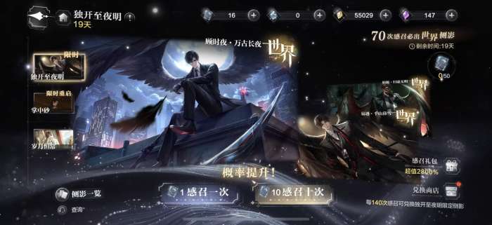 比较重点的就是玫之币的奖励,这个奖励累计到固定数量就可以兑换本次限定卡池的抽卡道具;跟着本次副本一起开启的还有限定的卡池,四个男主非常具有特色的世界侧影也是同步上线。