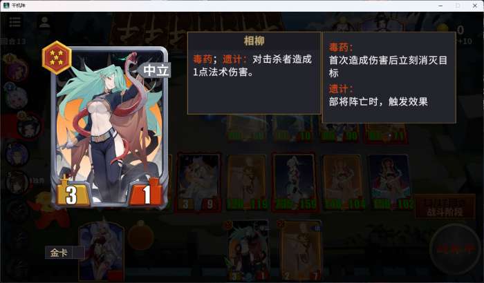 最后要给大家在分享一下五本的幻神卡。中立相柳大人,在决赛中。相柳能起到关键制胜的存在。站位和思路将决定你能否翻盘!他可以无脑克制一些属性大,一换多的卡。也就是我们常说的下毒,决赛不下毒,欢乐少一半儿~遇到此卡可以记得先存在手里哦~