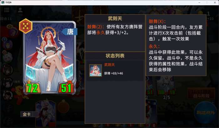 技能:选择一个友方部将,使其变为任意阵营,1回合和永久获得+1/+1。(随商店等级提升)