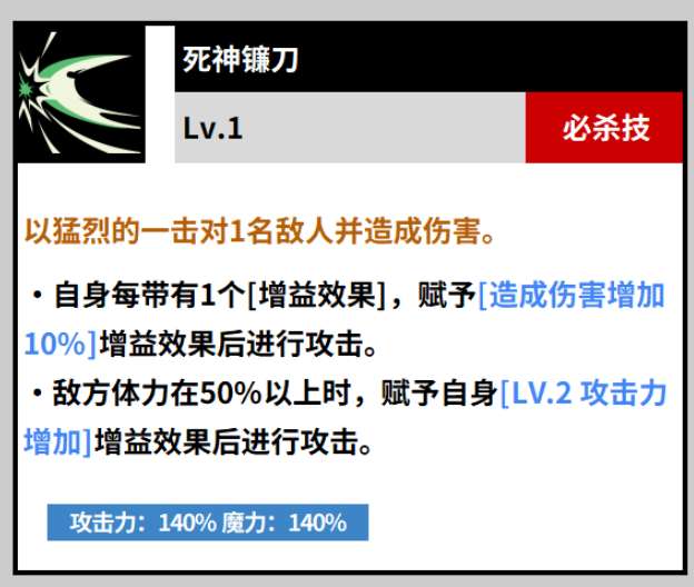 必杀技“死神镰刀”是杰克的核心输出手段,属于强力单体攻击技能。每携带一个正面增益状态,技能伤害提升10%;当敌方生命值高于50%时,还能为自己附加2级攻击增益,兼具高额伤害与斩杀潜力,适合用于终结关键目标。