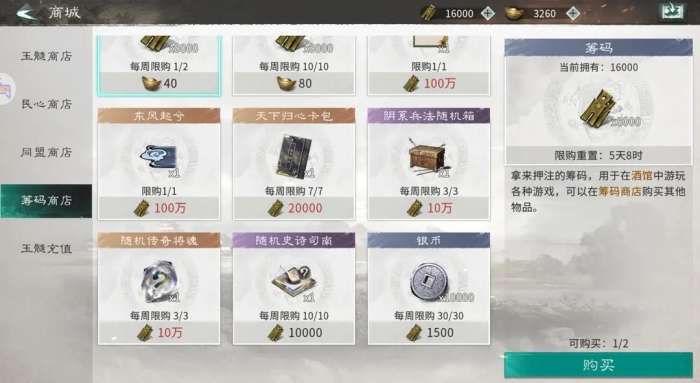 筹码与同盟商店则侧重武将养成维度,上架内容以稀缺性资源为主。其中,“将魂”与“司南”两类卡包尤为关键——二者在游戏中常规产出极低,但对武将进阶、技能突破及属性强化具有不可替代作用。若资源允许,建议优先配置此类养成向卡包,尤其适用于主力核心武将的深度培养阶段。