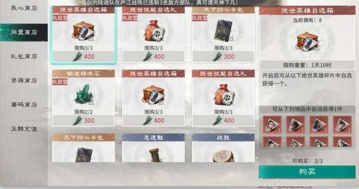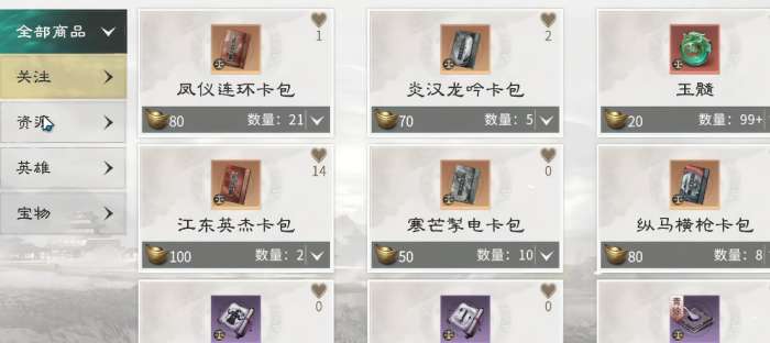 玉髓与民心商店聚焦英雄本体获取,支持按阵营定向补全未解锁武将。当玩家已通过抽卡获得高星级角色后,可在此两类商店中直接购置对应英雄专属技能卡包,快速提升战力闭环。该路径适合已有明确主力阵容、需强化关键技能链的中后期用户。