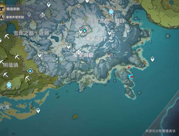 包括一片猪王的肉,这里加上前边3头6片肉,基本就够交任务了,如果不够,还可以去下图所示位置,大概有还有3头冰猪。