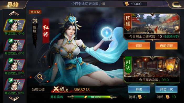 ①全紫/橙/红将均可通过拜访+切磋的方式进行获取,拜访需要拜帖,每日可重置拜访与切磋次数,提升真龙阁等级,可增加每日拜访次数。