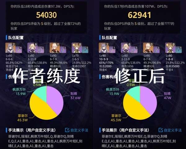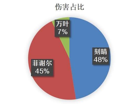 五星角色均为0+0配装,伤害占比刻晴48%菲谢尔45%万叶7%。