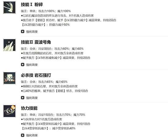 粉碎技能可以对单体目标造成100%的岩石属性伤害,若敌方处于晕眩状态,则额外附加50%的防御降低效果。震波号角能对全体敌人造成60%的岩石伤害,并减少其受到伤害减免的效果。岩石强打则提供65%的群体伤害,同时有40%概率使目标陷入晕眩。这些技能组合让她具备一定的控场能力,但在实战中触发条件较为苛刻,稳定性不足。