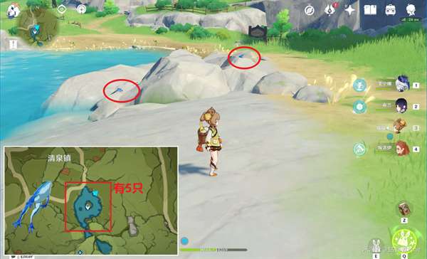 6,最后可以来到蒙德清泉镇传送锚点,周围一圈有5只蓝蛙可以拍摄