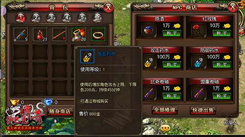在《沙巴克传奇》中,如果你碰到一位仁兄,前一秒战五渣,下一秒战力爆表,那么请你千万要淡定,他只是嗑了一种名为“攻击药水”的秘药。攻击药水顾名思义就是一定时间内提升战斗力的药水,在杂货铺有卖,可以持续提升你的攻击上限、下限,药效长达45分钟。