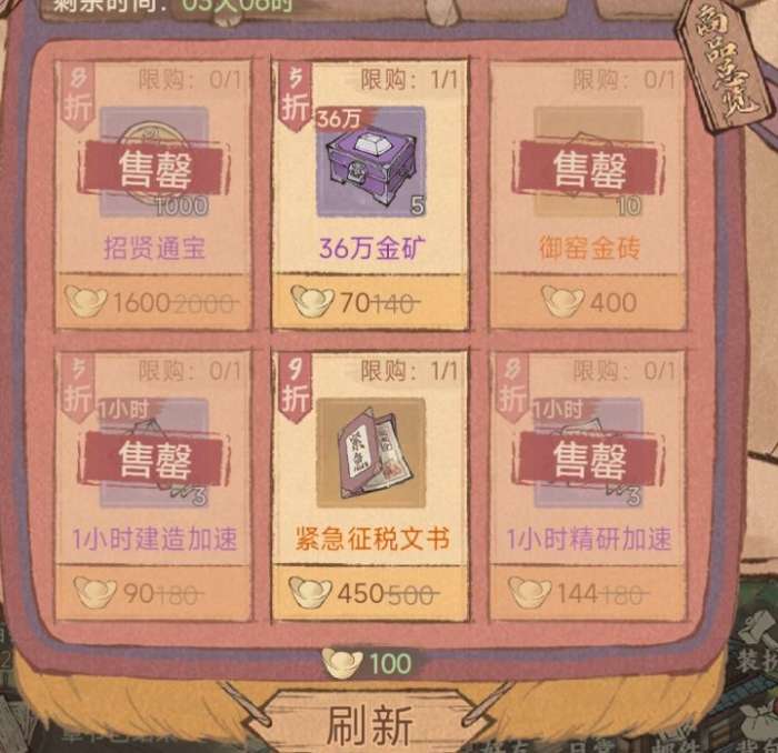 关键节点:刷新到50元宝的档位,一旦出现金砖或上述必买物品,即可停下购买。等待第二天刷新再次购买。