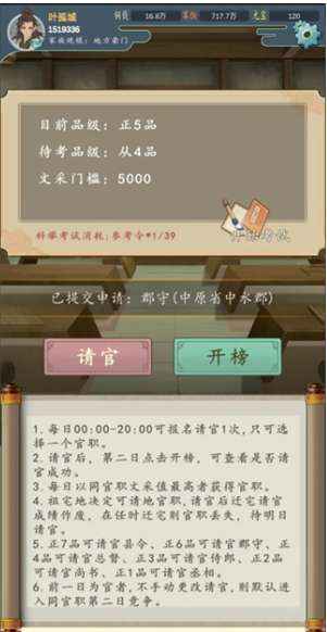科举主要是通过提高你文采值来进行的,没有速通只能通过家族发展慢慢积累,一定要仔细阅读下面的提示哦,正六品就能申请当官了。当天申请。次日上任