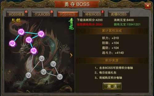 3、BOSS积分界面可以查看玩家当前积分等级和所加属性,BOSS积分可通过活动礼包和击杀BOSS掉落BOSS积分卷轴获得。