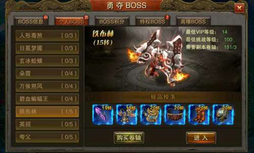 2、还可以进入个人BOSS界面挑战,获取装备,材料,个人BOSS总共有9个,等级转生等级提升难度逐步提升,个人BOSS每天可以挑战一定的次数,挑战成功可获得海量经验和魂珠碎片奖励,还可以花费少量天晶领取三倍奖励,使奖励倍增,这样可以快速的提高战斗力,进入个人BOSS需要消耗副本卷轴,可以在在线礼包和活动中获得副本卷轴,新手打宝地图和商城绑定天晶区也可以获得。