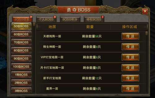 1、勇夺BOSS图标位于整个游戏的右上角,是争夺BOSS的指向标!玩家可以看到所有可攻击的BOSS信息,并且可以快捷传送到BOSS地图,通过BOSS信息可以直观看到每个危险区域BOSS的刷新状态。