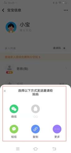 3、在宝宝信息页面, 我们有两种方法可以邀请家人加入,首先是邀请码,点击宝宝信息页面中间的“邀请码”;