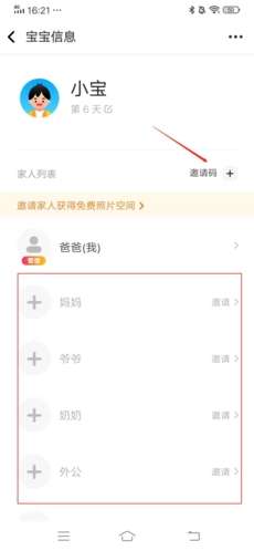 5、另一张方法就是点击宝宝信息页面下方的具体家人,这样可以将家人按照家庭身份邀请到相册中。