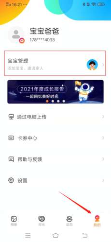 1、进入网易亲时光app后,首先点击右下角“我的”,再点击页面中间的“宝宝管理”;