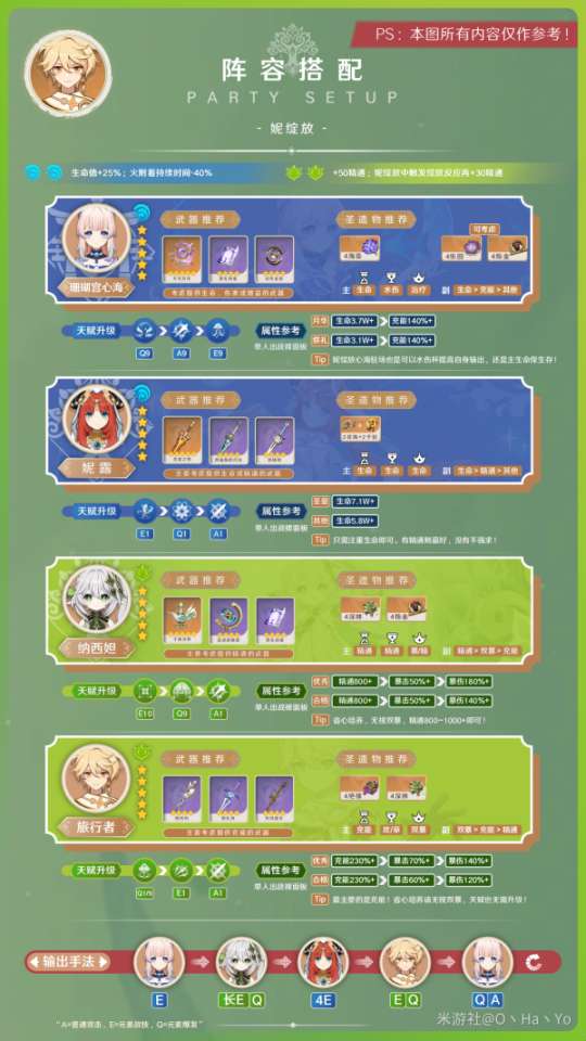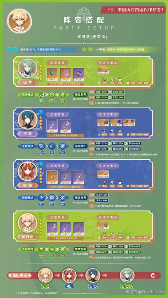 如果没有纳西妲时或者纳西妲在第二队无法抽身,也有无纳西妲的妮绽放搭配。