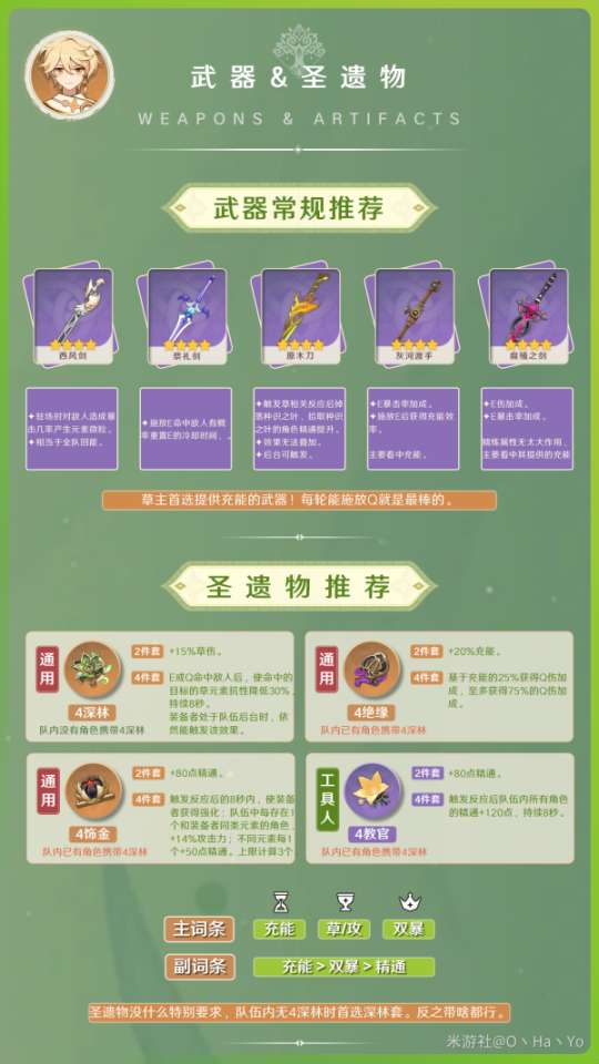 圣遗物可以灵活搭配,但基本的硬性需求是要有4件「深林的记忆」,但需要看看队伍里是否有人已经装备,如果有则考虑使用4件「绝缘之旗印」来提高Q技能的伤害能力和自己的能量充能效率,其次可以使用4件「饰金之梦」。如果作为工具人的话,可以考虑使用4件「教官」套装。