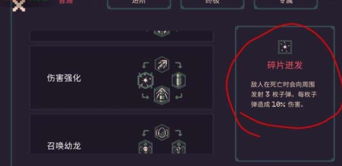 玩家可以直接选择蝙蝠作为武器,因为蝙蝠枪自带自动追踪的功能,而且在战斗的时候不需要瞄准,碰到敌人,还能够连续碰撞两次,所以不管是花火的雷电效果,还是点燃,冰冻等等特效,都能够触发,输出高效。能够满足具体的需求。不过在天赋方面建议玩家要有所讲究,在最初的时候不要直接点召唤,前期先用。怒眸,这个作为基础输出方面的保障,等到了后面的时候再使用燃烧或者是冰冻,建议先拥有基础元素效果,接着再点伤害强化和碎片,一旦敌人死亡之后,会自动射出子弹,这样的话能够有效的提高清怪的能力。