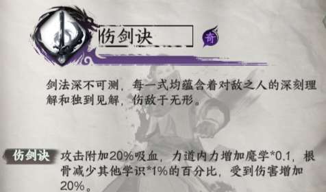 软件提交 专题合集 热门手游在《下一站江湖2》中,奇级剑护身绝技“伤剑决”可在淮陵武馆(140,571)通过外门弟子兑换获取。其效果为攻击附加20%吸血,力道与内力随魔学提升,但根骨会因其他学识而降低,且受到伤害增加20%,属于高风险高回报型武学。
