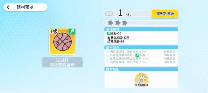 器材选择卧推装置战术板和篮球,玩四保一持球狂热是必须选择的,其他技能都无所谓