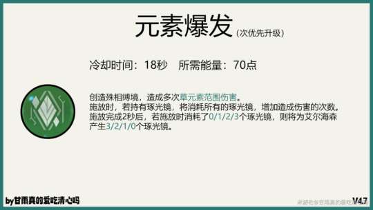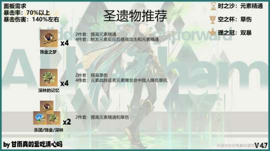 天赋加点9-9-9,其中草属性突破所需素材由翠翎恐蕈、无相之草以及周本肇始之乡产出;46个苍砾蕊羽由风蚀沙虫掉落;红绸由镀金旅团掉落;168个沙脂蛹由须弥沙漠和沙虫隧道采集;12个无心的渊镜由须弥周本boss正机之神掉落;天赋书巧思为周二、周五、周日在须弥副本昏识塔产出。