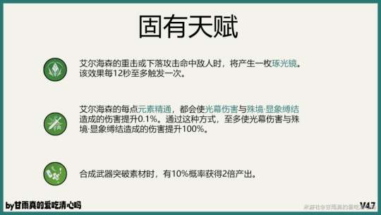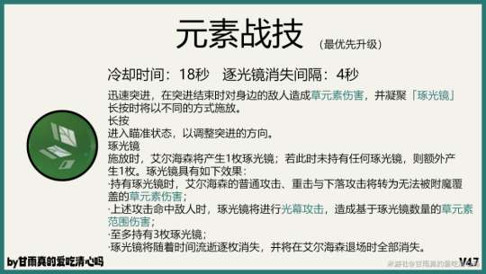 天赋一:艾尔海森释放重击或者下落攻击的时候会获得一枚逐光镜,需要命中敌人才会产生逐光镜。