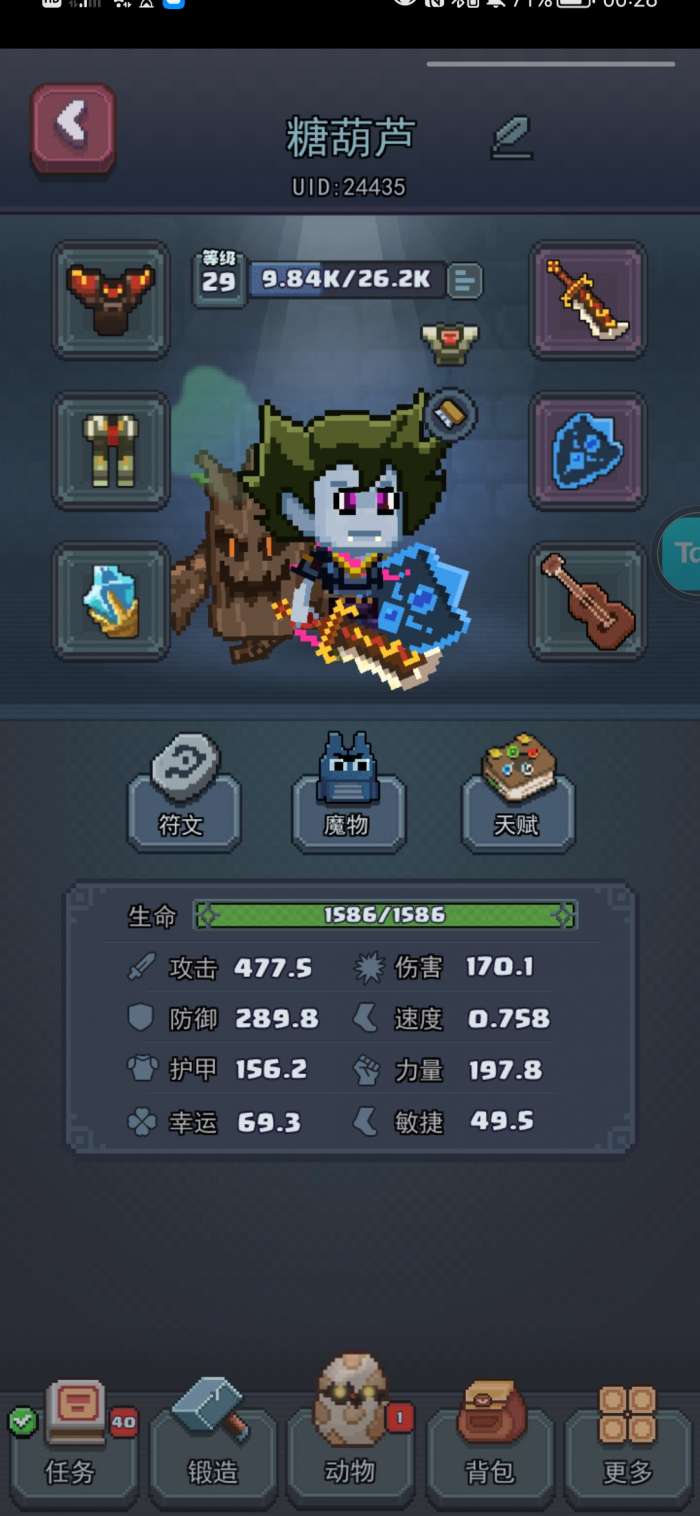 2、装备:我是只有武器和盾是紫的,其他的都是蓝的,因为武器和盾的紫图纸可以那钻石买,头骨玛瑙正好有十个,就做出来了,其他的都只能在祭坛(矿洞最底层左边入口)刷图纸,我一个整图都没刷出来呢;穿的这些装备都是同级别伤害、力量、攻击(防御装看防御、护甲)最高或者比较高的。
