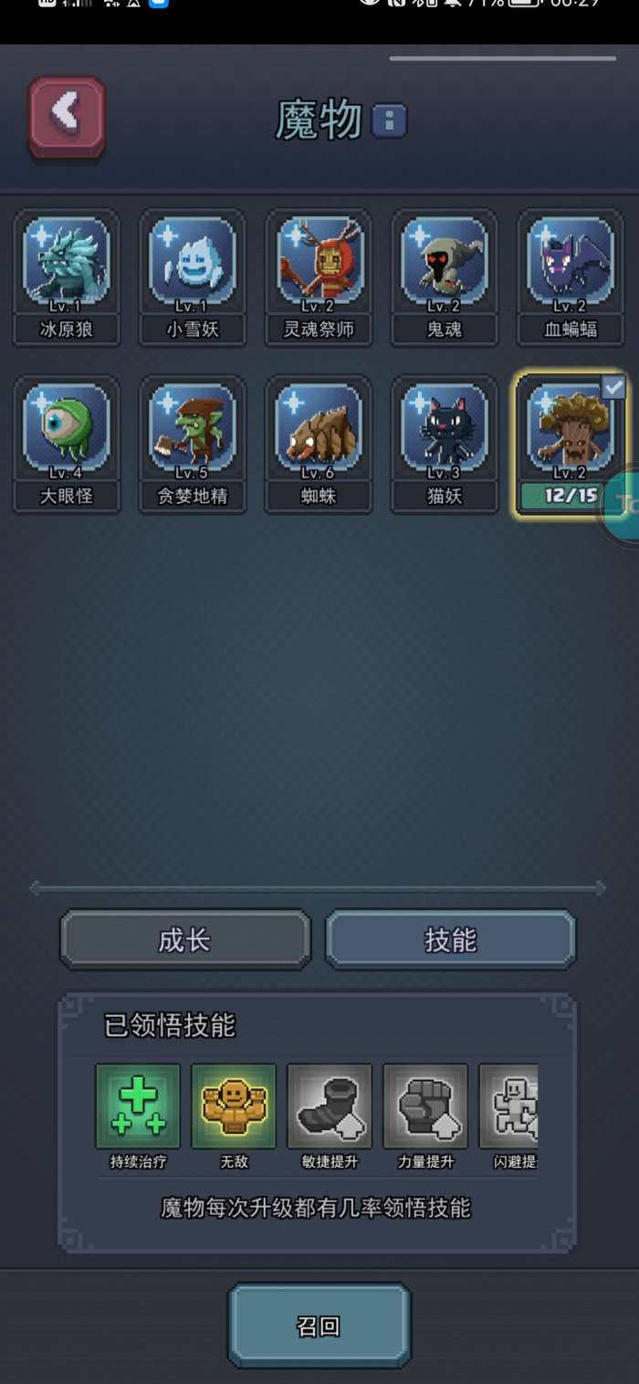 3、魔物:我带的是一只2级树妖,技能是持续治疗和无敌。魔宠其实品种等级都不重要,最重要的是技能,最好就是一个无敌一个治疗(快速治疗或者持续治疗),多了的话会延长每个技能的释放时间,所以技能不用求多,如果二级就有这俩技能直接用就行了,比其他的五六级的魔宠都好用。